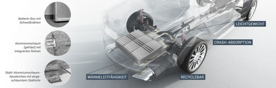 Der Einsatz von Leichtbau-Komponenten gewinnt für die Herstellung von Kraftfahrzeugen zunehmend an Bedeutung. Zukunftsweisende Entwicklungen von elektrisch angetriebenen Fahrzeugen erreichen die gesetzten Effizienzziele nur durch die konsequente Anwendung von extrem leichten Materialien, wie z. B. Aluminium. Aluminiumschaum vereint viele Vorteile, wie federleichtes Gewicht, Formbarkeit, Wiederverwertbarkeit sowie hervorragende Absorptions- und Leitfähigkeit und ist damit ideal für den Automobilbau der Zukunft geeignet. Eine wegweisende Entwicklung der Havel metal foam ist die Batterie-Box für Elektrofahrzeuge. Geringes Gewicht, gutes Crashverhalten, hohe Biegesteifigkeit und Möglichkeiten der Temperaturregulierung prädestinieren diese neu entwickelte Fahrzeugkomponente für den Einsatz in der modernen Automobilherstellung.