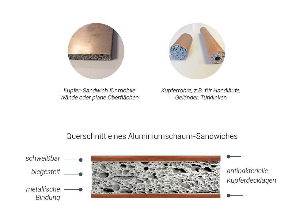 Besondere Zeiten erfordern besondere Maßnahmen. Auf herkömmlichen Trennwänden und anderen Oberflächen können sich Viren und Bakterien mehrere Tage niederschlagen. Das für das Coronavirus unangenehmste Material ist Kupfer: Der Erreger war nach nur wenigen Stunden nicht mehr nachweisbar. Als Teilchen, die in der Luft umhergewirbelt werden, bleiben Coronaviren den Studien zufolge etwa drei Stunden ansteckend. 1,5 - 2 Meter Abstand zu halten ist vielerorts schwer zu realisieren. Um Bereiche voneinander zu trennen, können Trennwände aufgestellt werden. Sie leiten die Menschen in kontrollierten Abständen und Bahnen und mindern so das Ansteckungsrisiko. Auch Handläufe, Türklinken, Griffe und Haltestangen können aus Kupferrohren mit Aluminiumschaum hergestellt werden und einen höheren Sicherheitsfaktor gewährleisten.